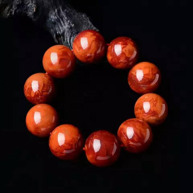 好了言归正传啊,大家看我手上的这串南红火焰红手串,是不是非常漂亮。