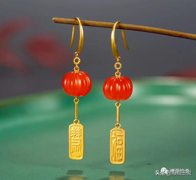 唐·慧立《大慈恩寺三藏法师传》:“菩萨为行,福慧双修,智人得果,不忘其本。”耳坠主体为南瓜造型,下坠饰以金牌,分别镶嵌以“慧”、“福”二字,造型雅致古朴,佩之喜悦典雅。