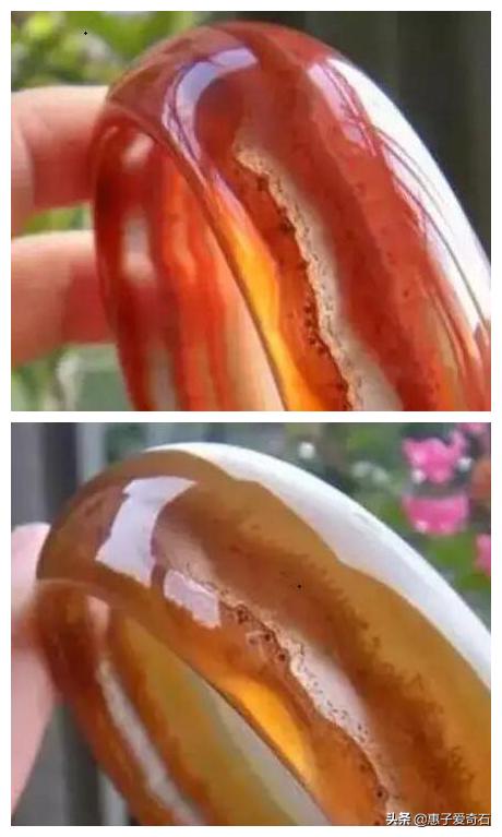 第一,烧色。这个办法最早是日本人搞出来的,所以行内称之为东红。这种作假其实是用了一个化学方法,大部分南红中是二价铁和三价铁并存的。但只有三价铁呈红色,因此红色纯度不够。于是就采用高温将二价铁转变成三价铁。烤色玛瑙比原色玛瑙更通透,烤过的南红都会有“火劫纹”。借助放大镜可以清晰分辨,玻璃感更强,特别是珠子的穿孔处会有一圈玻璃状圆圈。烤色过的南红颜色更死板,缺乏自然油润性,颜色相对变暗。