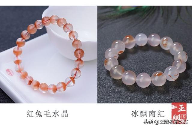 下面这张真假南红冰飘对照图,则展现的是冰飘南红与其相似玉料‘红兔毛水晶’的差别。可以看到,红兔毛水晶乍一看也十分肖似冰飘南红,因此很容易造成人的视觉混淆。不过分别两种的方法也很简单,我们仔细观察两种玉石的冰㡳,真正的冰飘南红再干净、清透,也会带有明显的朦胧跟和胶质感;而红兔毛水晶的㡳则十分透明,带有一种明显的水晶质感,其中差别还是很明显的。