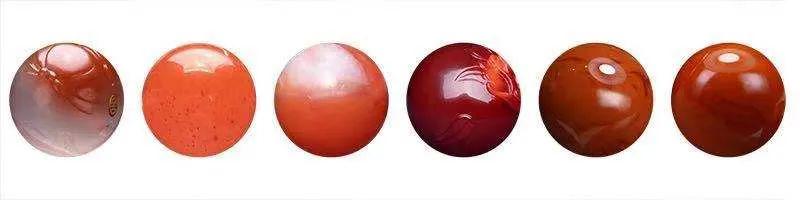 上图为南红颜色示意图,从左到右依次为:冰种、樱桃红、红白料、玫瑰红、柿子红、锦红。