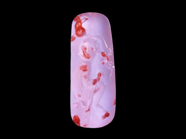 灵猴献瑞,四川凉山南红赤玉,极品高冰飘花俏柿子红,色体到顶,天然俏色巧雕 ,红红眼睛红红桃,原矿三无,雕刻精致细腻,刻画生动有趣,苏工名家作品
