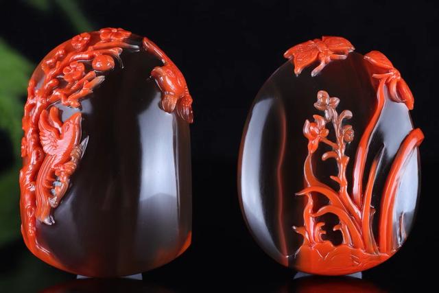 川料南红中有一种红皮黑心的料子,做出的产品上颜色醒目分明非常养眼,这两种颜色如果分开后都比较普通,合在一起却是相互衬托与成就。并且这种料子油性极足,抓在手里非常润,如果不看东西还以为是和田玉呢,下面你一起见识一下它的风采……油黑色与柿子红...